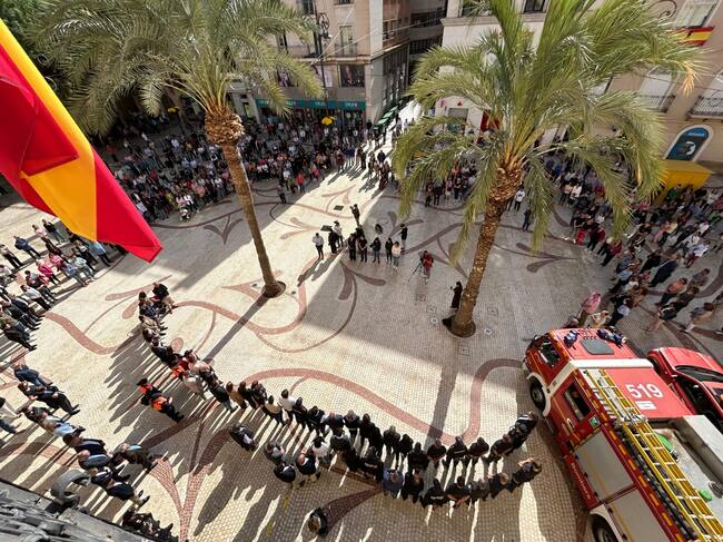 La corporación municipal, voluntarios de la Fundación Conciénciate, miembros de la Policía Local, efectivos de Bomberos y Protección Civil, junto a varios cientos de ilicitanos e ilicitanas se han congregado este lunes en la Plaza de Baix donde han guardado cinco minutos de silencio en recuerdo a las personas fallecidas por los efectos de la devastadora DANA que ha azotado especialmente a distintos municipios de la provincia de Valencia.