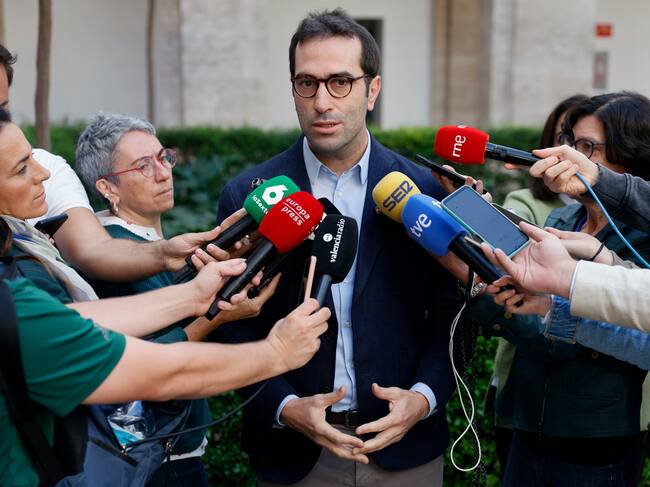 El ministro de Economía, Comercio y Empresa, Carlos Cuerpo hace declaraciones a los medios antes de su encuentro en Valencia con las principales asociaciones empresariales y representantes de los sectores afectados por la dana. / Ana Escobar (EFE)