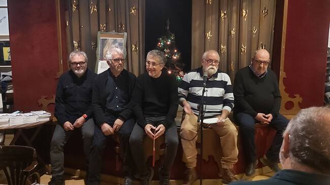 Xavi Cortés, Manolo Antolí, Pep Jordá, Pep Sou i Javier Llopis, en la presentació del llibre en el pub L'Escenari / Radio Alcoy