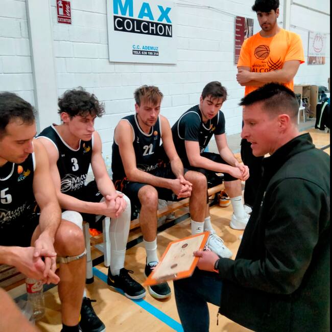 Pau Agulló, en un temps mort d'un partit del primer equip sénior masculí del Nou Bàsquet Alcoi / Paco Agulló
