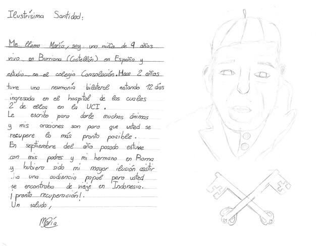 María, una niña de 9 años de Burriana, ha escrito una carta dirigida al papa Francisco para animarlo durante su hospitalización en el Gemelli de Roma, donde permanece ingresado por una neumonía bilateral.