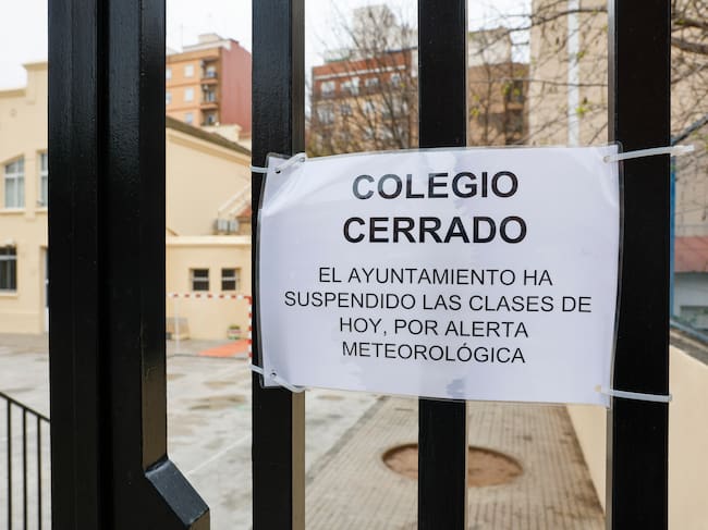 GRAFCVA6034. VALENCIA, 06/03/2025.- Detalle de un cartel en la puerta de un colegio que anuncia la suspensión de clases durante este jueves ante la alerta meteorológica naranja en la ciudad de València. EFE/Ana Escobar / Ana Escobar (EFE)