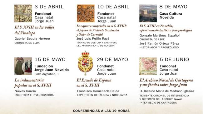 La Concejalía de Cultura, la Fundación Mediterráneo y la Fundación Jorge Juan han unido sus esfuerzos para llevar a cabo este ciclo histórico que ofrecerá una visión profunda de cómo vivió Novelda en la época en la que Jorge Juan nacía en El Fondonet, haciendo historia tanto en la ciencia como en la Armada. Entre los meses de abril y junio, las conferencias se desarrollarán en diversos espacios, como la Casa Natalicia del Sabio Español, la sede de la Fundación Jorge Juan y la Casa de Cultura. Los temas a tratar incluyen: el siglo XVIII en los Valles del Vinalopó, los ajuares nupciales de la época (con el joyero de Violante Santacilia como protagonista), una aproximación histórica y arqueológica a la Novelda del Siglo de las Luces, la indumentaria popular del momento, el escudo de España de entonces y el archivo naval de Cartagena y sus fondos sobre Jorge Juan.