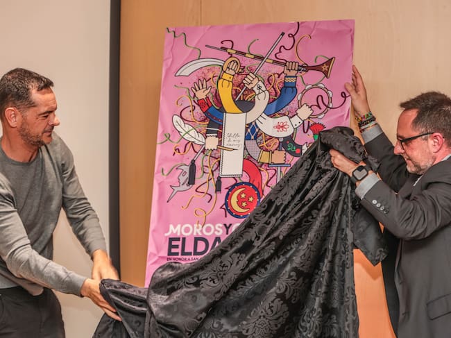 En su cartel para las Fiestas de Moros y Cristianos de Elda 2025, Salvador ha logrado el equilibrio perfecto entre lo tradicional y lo moderno. La obra transmite el espíritu festivo de las celebraciones, utilizando una paleta de colores vibrante, en la que predomina el rosa, un detalle que no ha pasado desapercibido. Cuando le preguntamos sobre su elección de este color, Salvador explicó que el rosa “tiene una simbología carnal… el abrazo, el hermanamiento, el desfilar agarrados, juntos, y porque el color contrasta muy bien como fondo con el resto de los colores”.