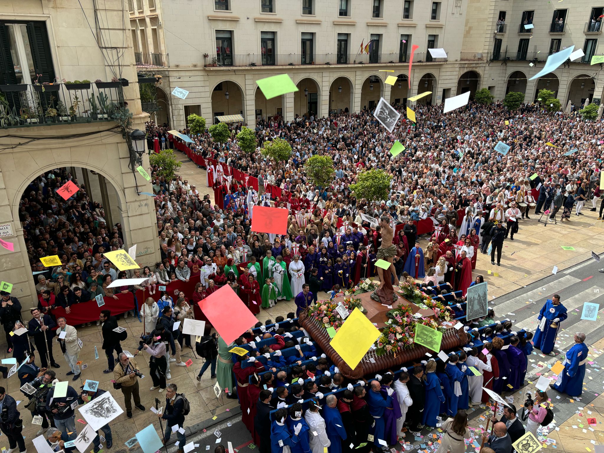 Alicante ha cerrado este domingo una Semana Santa de récord, con más de 11.000 hermanos y cofrades participando en los 27 desfiles procesionales, con el Encuentro entre la Virgen de la Alegría y el Cristo Resucitado. Ese momento ha estado rubricado por el lanzamiento de millares de aleluyas en una abarrotada plaza del Ayuntamiento y en las calles aledañas. A continuación, ambas imágenes han continuado en procesión por la Explanada de España y Rambla para protagonizar un segundo y último Encuentro en la plaza del Abad Penalva, ante la concatedral de San Nicolás. El alcalde Luis Barcala, que ha acompañado a la Virgen de la Alegría desde la salida en la basílica de Santa María hasta la plaza del Ayuntamiento, se ha sumado posteriormente a la comitiva del Resucitado.