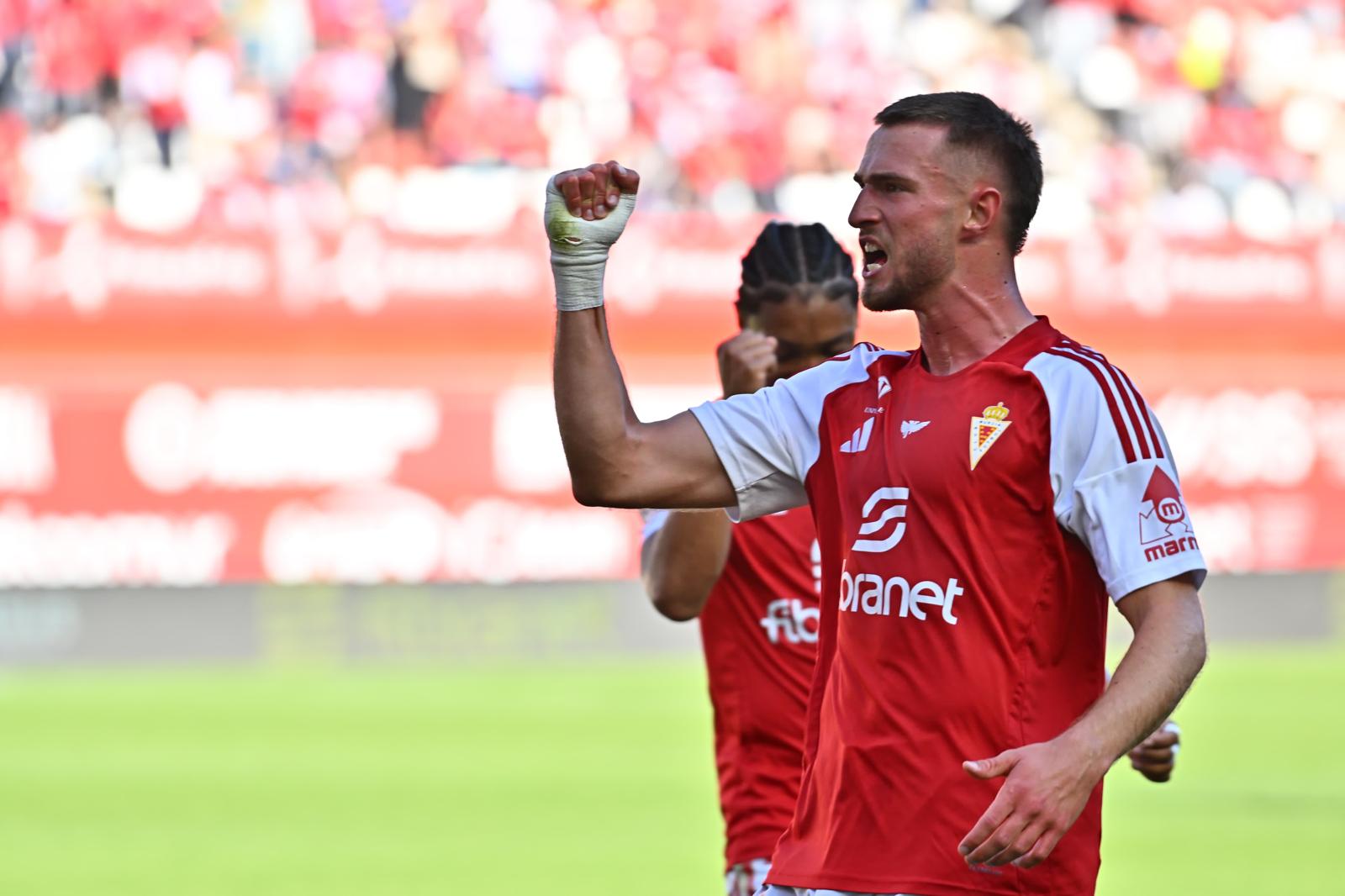 David Flakus, jugador del Real Murcia, celebra un gol en el Enrique Roca ante el Villarreal B / RMU
