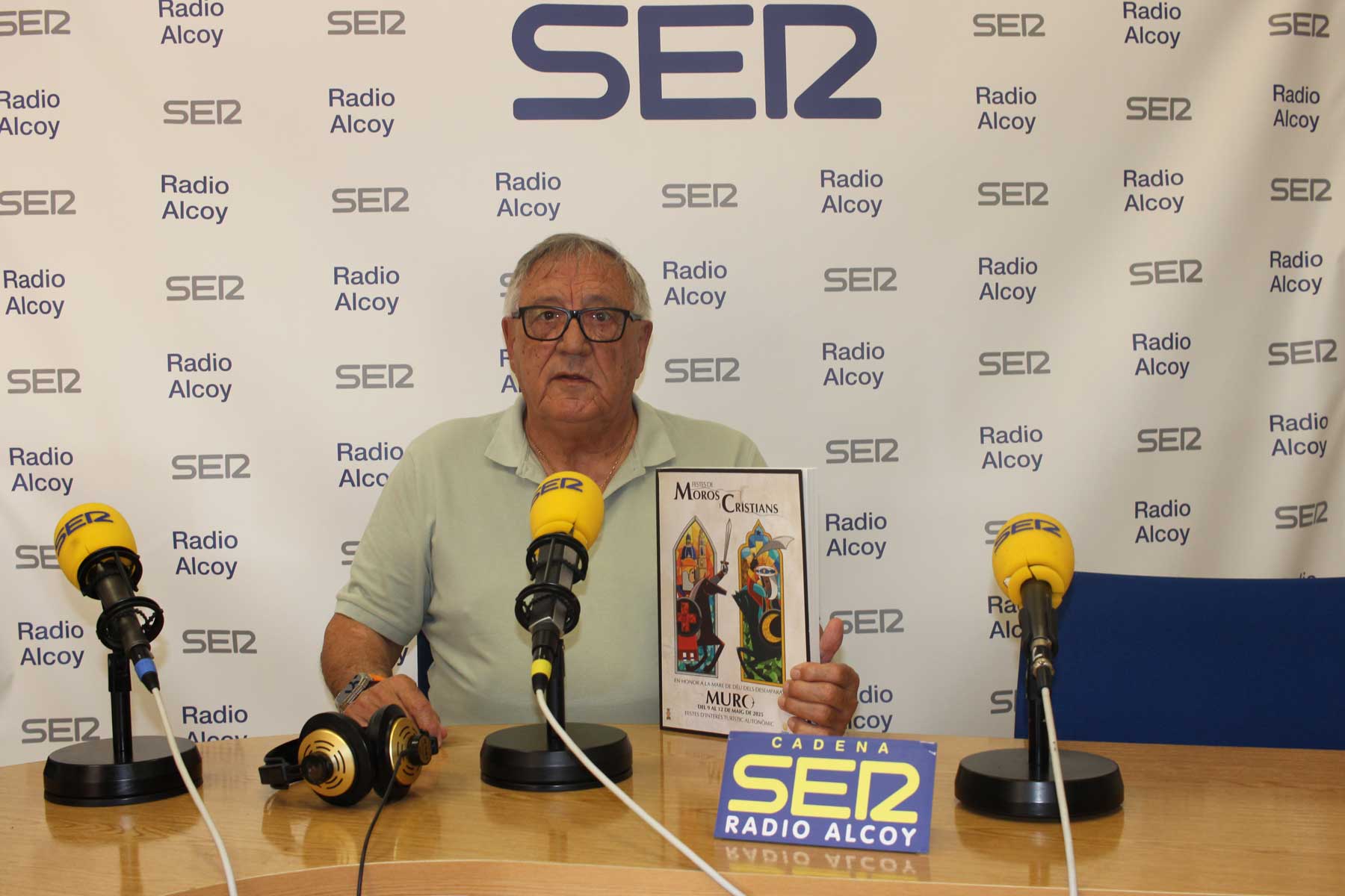 El alcalde de Fiestas murero, Paco Vicedo, en el estudio central de Radio Alcoy, con un ejemplar de la revista de Fiestas