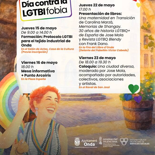 Las actividades continuarán en el ámbito cultural. El jueves 22, en el marco de la Fira del Llibre d’Onda, se presentarán obras vinculadas al colectivo LGTBI, como Una maternidad en transición de Carolina Marzá, Memorias de Shangay de Jose Mola, y la revista LGTBQ Blendy, con la participación del artista Frank Dano.