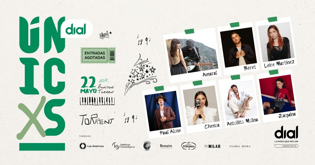 Cadena Dial organiza -por quinto año consecutivo- una nueva edición de Dial Unicxs en Torrent (Valencia). El próximo jueves 22 de mayo, a partir de las 20:00 horas, l'Auditori de Torrent albergará un concierto muy especial en el que participarán Leire Martínez, Amaral, Chenoa, Beret, Antoñito Molina, Paul Alone y Joaquina.