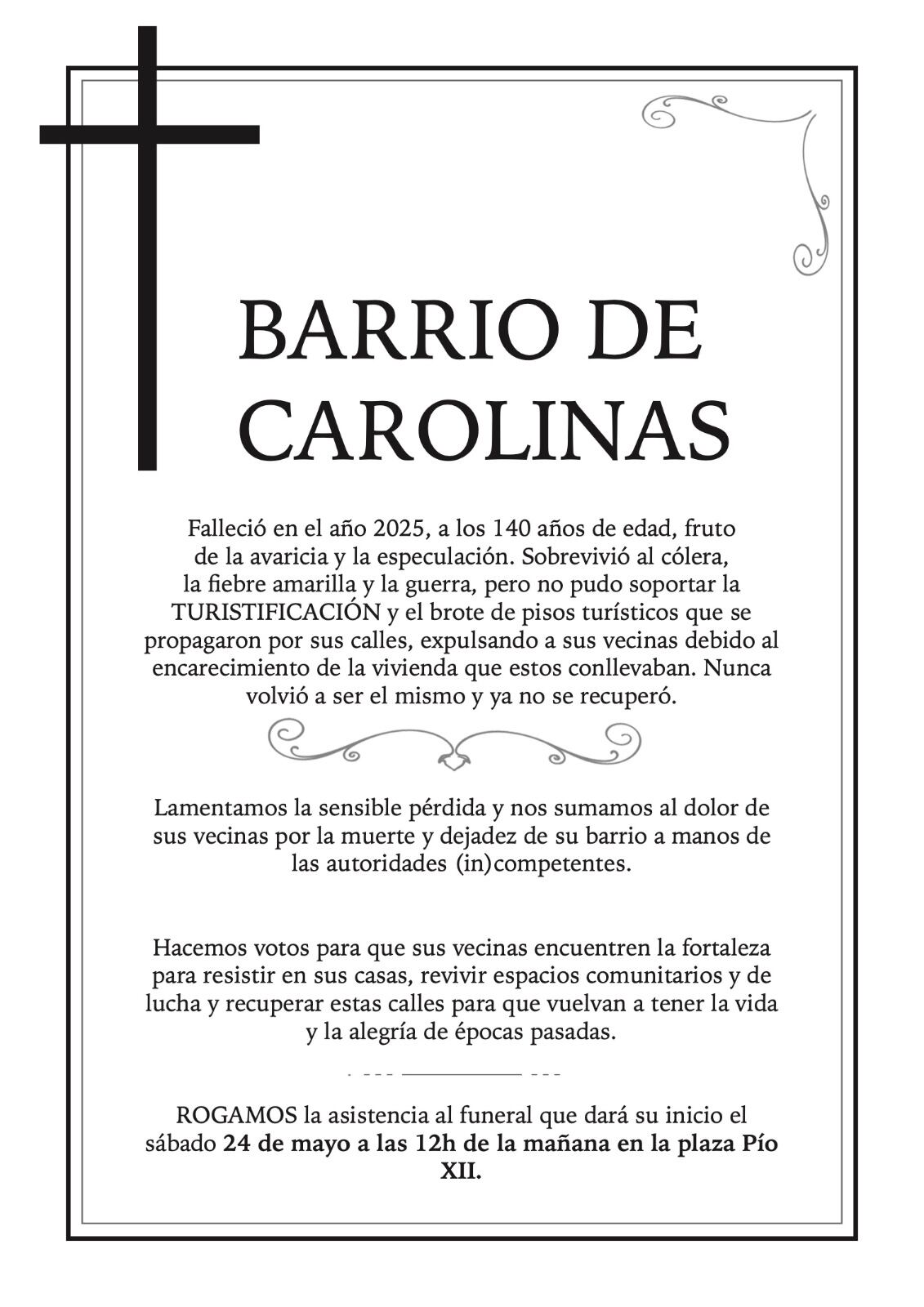 Este sábado tendrá lugar a mediodía el funeral, al ritmo de una banda de jazz para la marcha fúnebre, en la plaza Pío XII, con el objetivo de "ir identificando aquello que está matando al barrio".