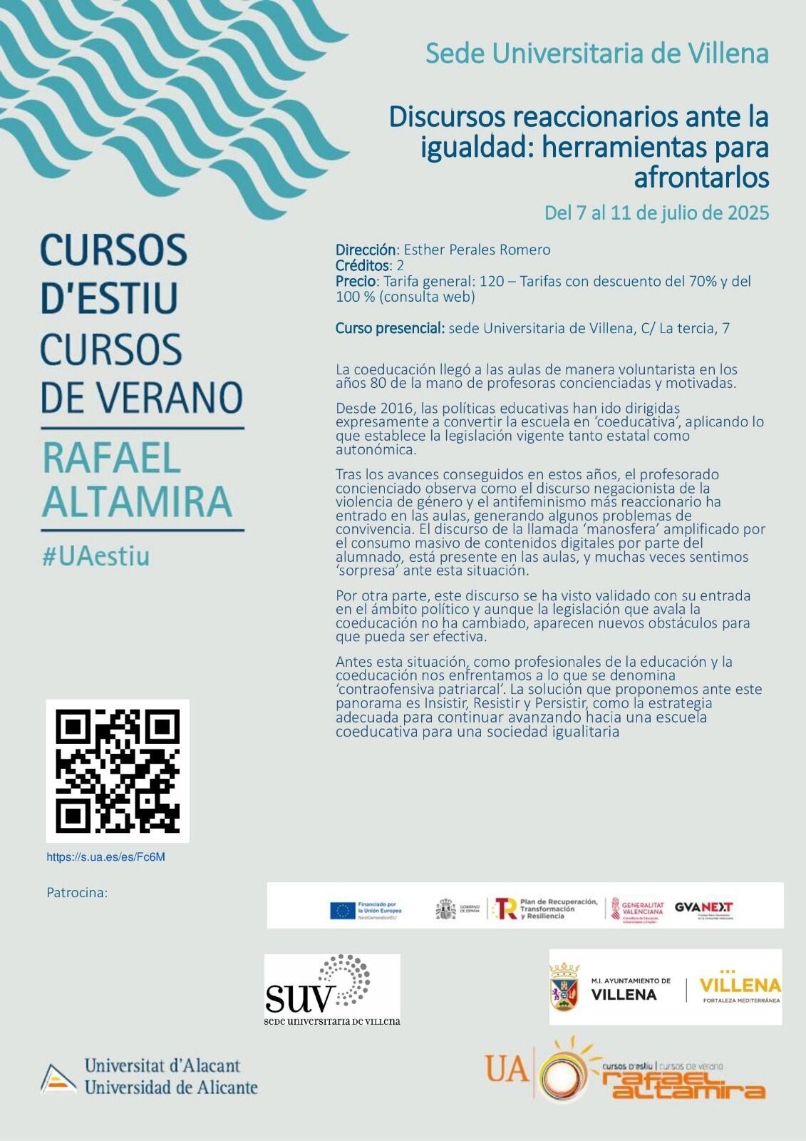 Para más información, entra en este enlace: https://web.ua.es/es/verano/2025/sedes/villena/discursos-reaccionarios-ante-la-igualdad-herramientas-para-afrontarlos.html