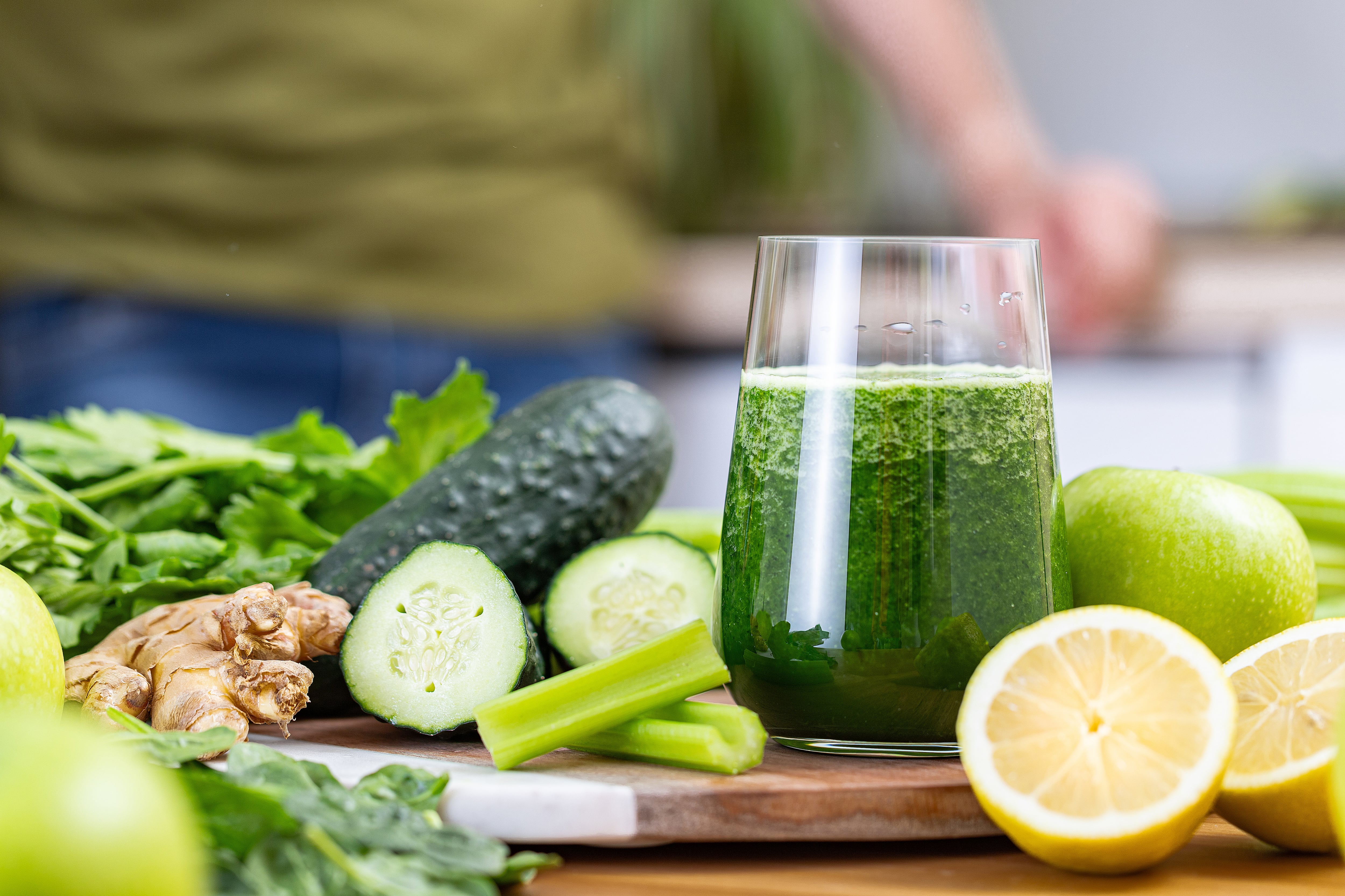 Vaso de jugo detox rodeado de frutas y verduras en una mesa de cocina. / carlosgaw