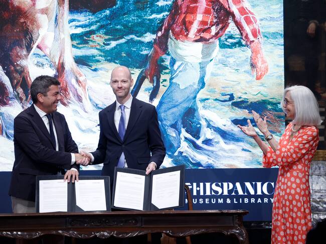 VALENCIA (ESPAÑA), 24/07/2025.- El president de la Generalitat, Carlos Mazón (i) junto con el director de la Hispanic Society, Guillaume Kientz (c) y la bisnieta de Sorolla, Blanca Pons-Sorolla (d) durante la firma del acuerdo marco entre la Generalitat y The Hispanic Society of America para la creación del Espacio Expositivo de la Colección de Sorolla en el Palacio de las Comunicaciones de València -el antiguo edificio de Correos-, donde se exhibirán obras del pintor valenciano cedidas por dicha entidad neoyorquina. EFE/ Biel Aliño / BIEL ALIÑO (EFE)