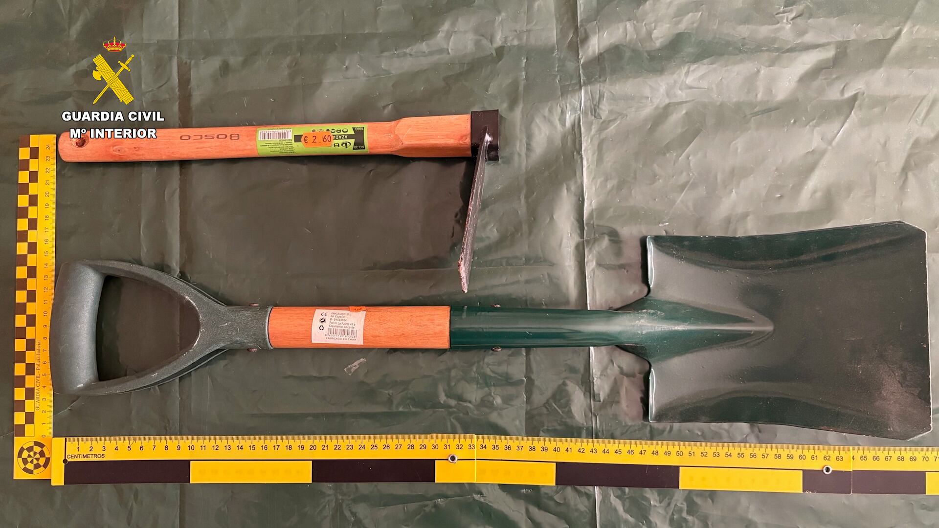 Durante los registros practicados, la Guardia Civil ha recuperado una garrafa de gasolina, supuestamente destinada a la destrucción del vehículo y el cuerpo de la víctima, así como una pala y una azada empleadas para enterrar el arma en una zona de montaña próxima a Penáguila.