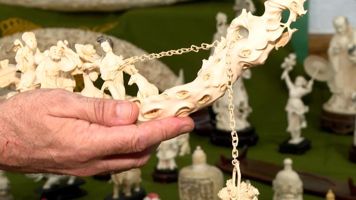 De entre todas las piezas destacaba un cuerno de marfil tallado con gran detalle de 1,77 metros de longitud y 22 kilogramos de peso que data del siglo XIX, además de otras 126 tallas de entre 40 y 90 centímetros.