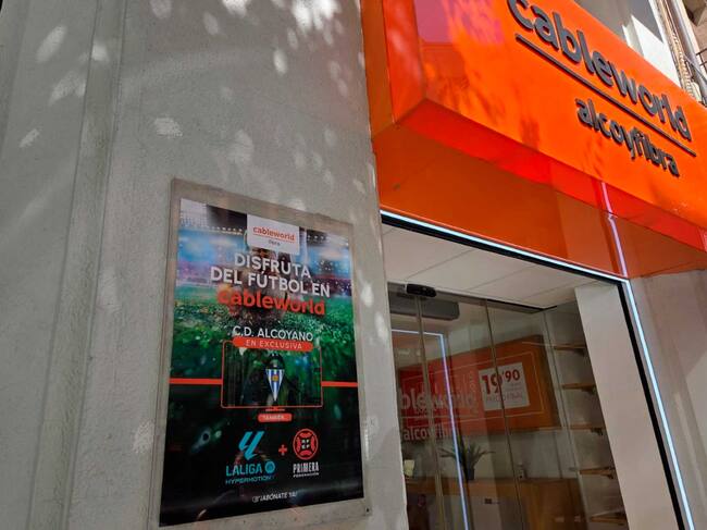 En la fachada de la tienda de cableworld en Alcoy ya está la promoción de poder ver los partidos del CD Alcoyano / Radio Alcoy