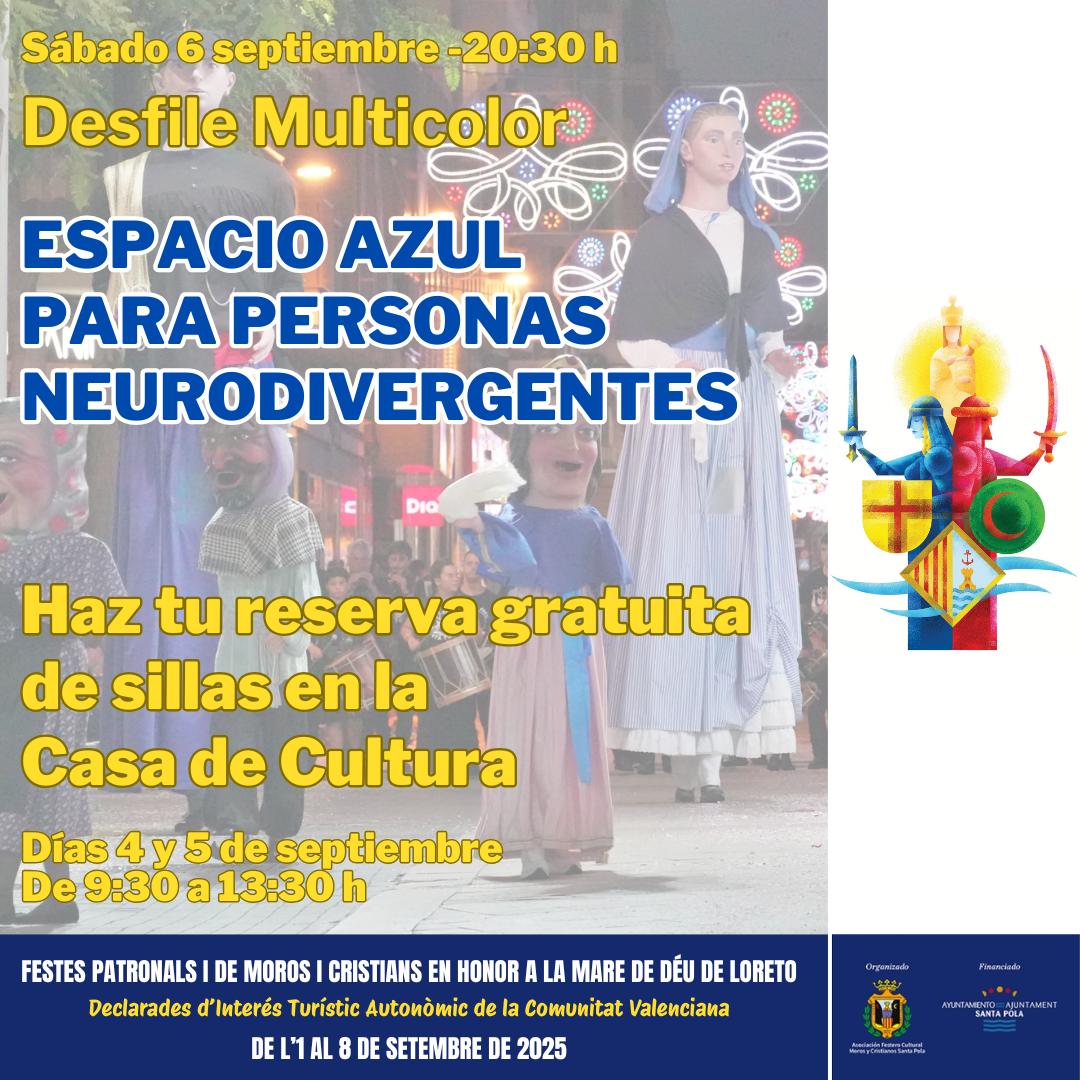 Con el fin de mejorar la experiencia de todos los ciudadanos y ciudadanas y que puedan disfrutar al máximo de las fiestas patronales, el Ayuntamiento de Santa Pola tiene previsto crear en el recorrido del desfile multicolor del 6 de septiembre un espacio azul para personas neurodivergentes.