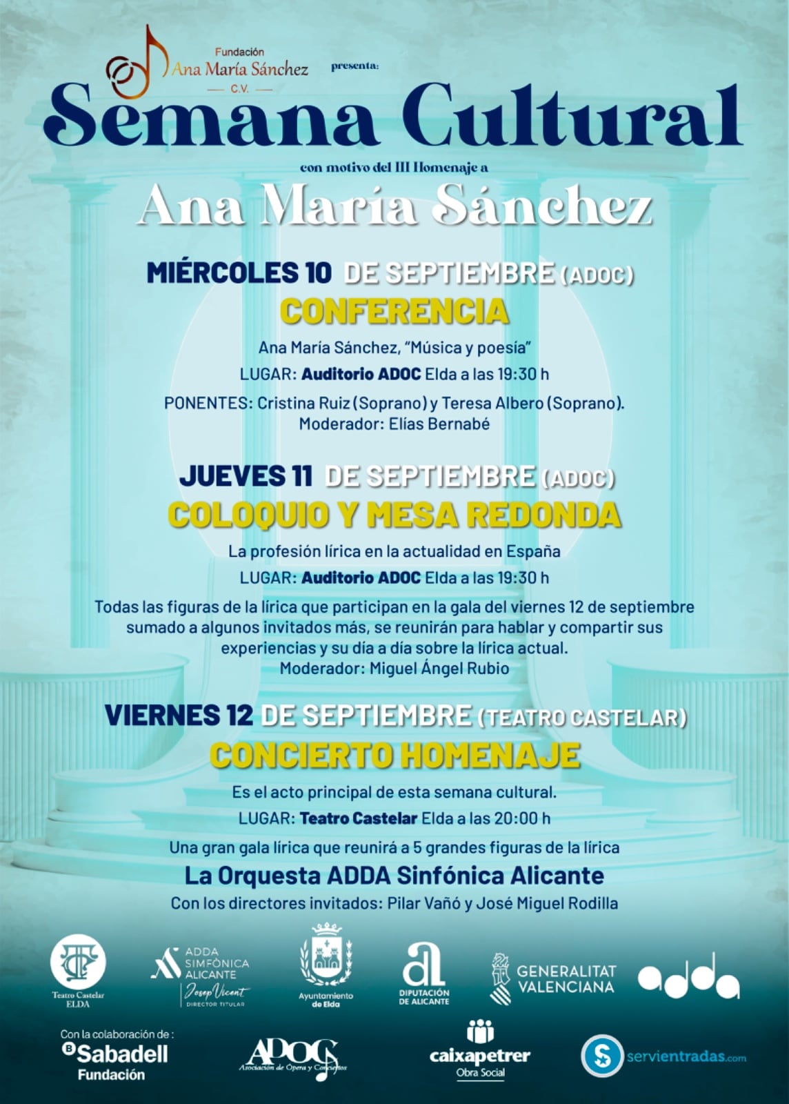 El broche de oro llegará el viernes 12 con la gala homenaje en el Teatro Castelar, dirigida por Pilar Bañó y José Miguel Rodilla, que contará con voces como Teresa Albero, Maite Alberola, Cristina del Barrio, Eduardo Sandoval y Manuel Más. Con una primera parte dedicada a la ópera y una segunda a la zarzuela, el concierto promete emocionar tanto a melómanos como a quienes se acerquen por primera vez a este repertorio. Las entradas, disponibles en servientradas.com al precio de 15 euros, tienen además un fin solidario: financiar becas, concursos y nuevos proyectos de la Fundación Ana María Sánchez.
