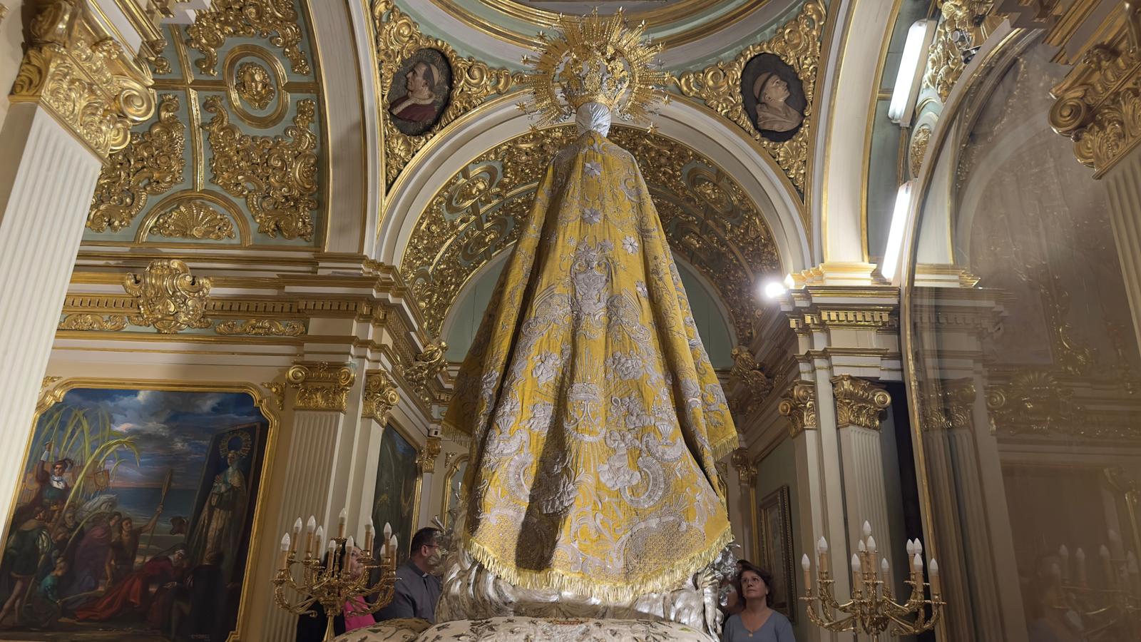 La Virgen de la Asunción vuelve a lucir su manto original, una pieza bordada a mano por las hermanas Clarisas hace un siglo y que constituye uno de los pocos vestigios que se conservaron tras el incendio que destruyó la imagen original antes de la Guerra Civil. Ahora, la pieza ha vuelto a brillar gracias a una restauración integral por parte del Instituto Valenciano de Conservación, Restauración e Investigación.