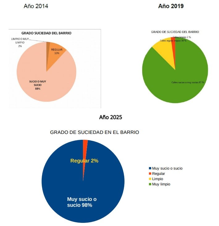 También cambia el motivo de esa percepción de la suciedad. Si los excrementos ocupaban el primer lugar, ahora son las bolsas de basura fuera de los contenedores, las que priman en la preocupación, seguidas de los excrementos y, en tercera posición los muebles desechados y restos de obras.