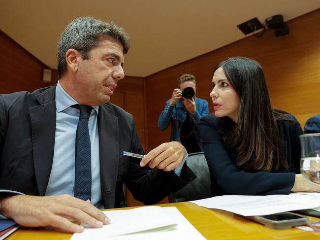 GRAFCVA313. VALENCIA, 11/11/2025.- El president de la Generalitat en funciones, Carlos Mazón, conversa con la presidenta de la comisión, Míriam Turiel (Vox), durante su comparecencia en la comisión de investigación de Les Corts Valencianes sobre la dana, su primera aparición pública tras su dimisión el pasado 3 de noviembre. EFE/Manuel Bruque / Manuel Bruque (EFE)