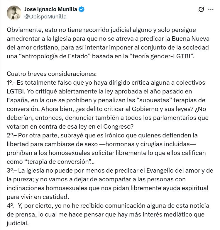 A través de la red social X, el obispo Munilla ha opinando que "obviamente esto no tiene recorrido judicial alguno y solo persigue amedrentar a la Iglesia para que no se atreva a predicar la Buena Nueva del amor cristiano, para así intentar imponer al conjunto de la sociedad una 'antropología de Estado' basada en la “teoría gender-LGTBI”.