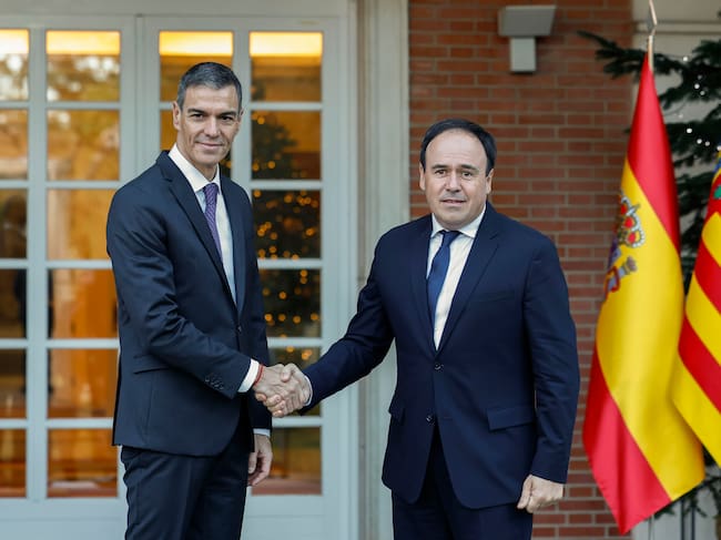 FOTODELDÍA MADRID, 17/12/2025.- El presidente del Gobierno, Pedro Sánchez (i), saluda al presidente de la Generalitat Valenciana, Juan Francisco Pérez Llorca, con quien se reúne este miércoles en Moncloa. EFE/Chema Moya / Chema Moya (EFE)