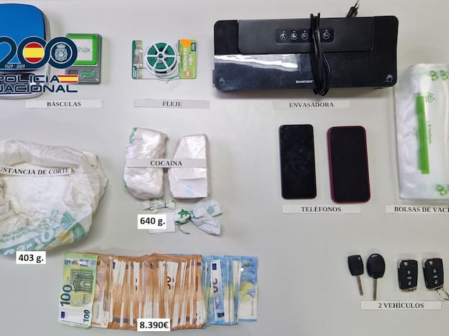 La operación culminó con una entrada y registro en una vivienda y un trastero, utilizado como base para las actividades ilícitas. En el registro, los agentes intervinieron 8.390 euros en efectivo, 640,8 gramos de cocaína, 403,6 gramos de sustancia de corte, además de básculas de precisión, una envasadora, bolsas de vacío, teléfonos móviles y dos vehículos.