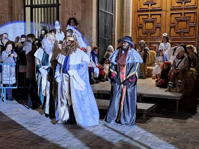 Los Reyes Magos de Oriente han sido recibidos por las autoridades locales en la puerta del Ayuntamiento, y todos juntos han salido a los balcones de la Casa Consistorial donde el Alcalde, David García, les ha entregado las llaves de la población y les ha dado la bienvenida.
