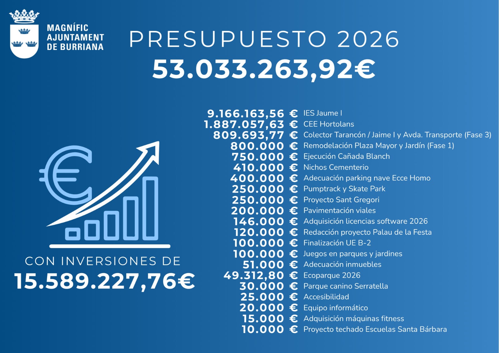 El concejal de Hacienda, Alejandro Clausell, ha destacado que “vamos a levar a Pleno un presupuesto récord de más de 53 millones de euros que supone un espaldarazo a la transformación de Burriana que emprendimos hace dos años y medio. Son unas cuentas que nacen de una gestión responsable, tras dos años de bajadas de impuestos consecutivos que nos han situado como uno de los municipios con menor presión fiscal de la provincia, y que pese a este esfuerzo podemos anunciar una inversión de 15,5 millones de euros para 2026”.