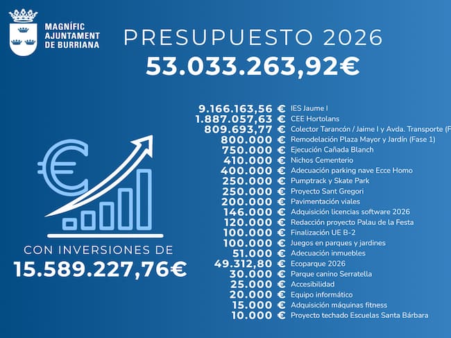 Unas cuentas, las mayores de la historia de la ciudad, que nacen después de dos años de bajadas de impuestos que han consolidado a Burriana como uno de los municipios con menor presión fiscal de la provincia. En el programa de inversiones para el año 2026, que alcanza una cifra global de 15.589.227,76 euros destacan la finalización de grandes infraestructuras educativas, la mejora de los servicios públicos y la modernización de los espacios urbanos.