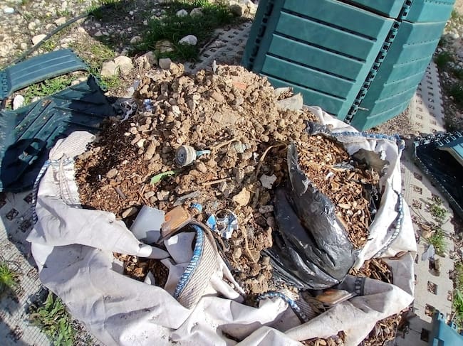Asi, la compostera apareció tirada en el suelo, con el saco de compost abierto y expuesto a la intemperie, mezclado con excrementos de perro y otros residuos no orgánicos que deberían haber sido llevados al ecoparque.