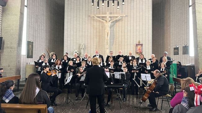 La Coral Santos Patronos, junto a la Orquesta de Cámara "Ciudad de Elda", ha actuado tras la eucaristía en la abarrotada iglesia de San Francisco.
