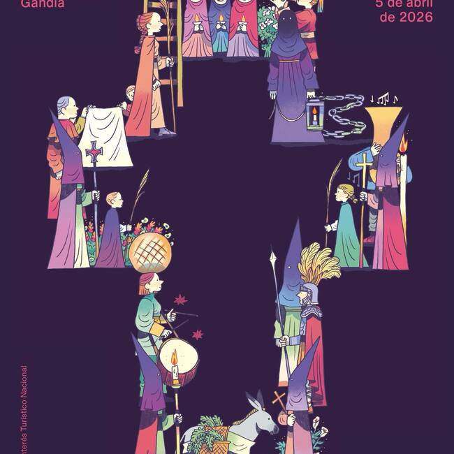 La Semana Santa de Gandia ha presentado hoy el cartel anunciador de 2026. El cartel, obra de Nuria Tamarit y Santi Vicente, propone una mirada “contemporánea, inclusiva y diversa de estas celebraciones religiosas”, Fiesta de Interés Turístico Nacional, en la que se sientan identificadas tanto las personas que participan activamente en los diferentes actos como la ciudadanía de Gandia y quienes desean conocerla y disfrutarla.