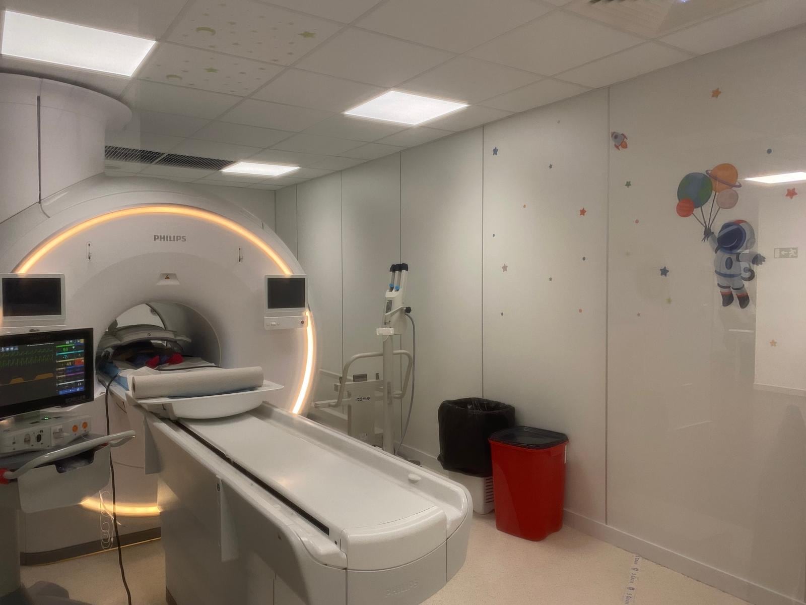 A partir de esta idea, el personal de Resonancia ha decorado la sala con motivos espaciales, transformando el espacio técnico en un entorno más cercano y positivo para los más pequeños.