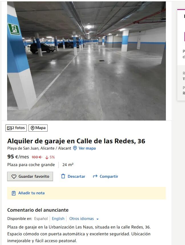 Anuncio de alquiler de una plaza de garaje en la urbanización Les Naus / Cadena ER