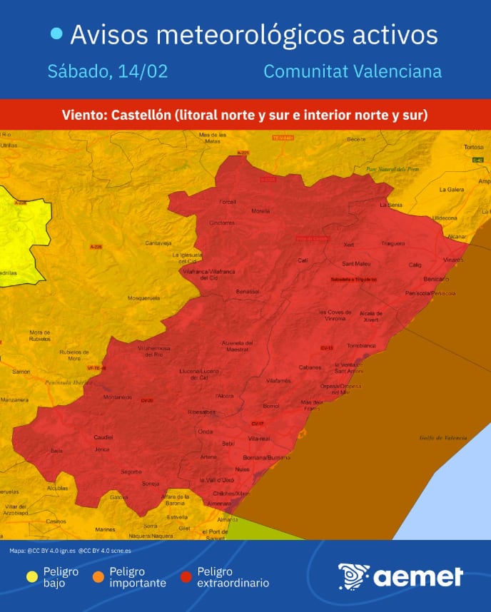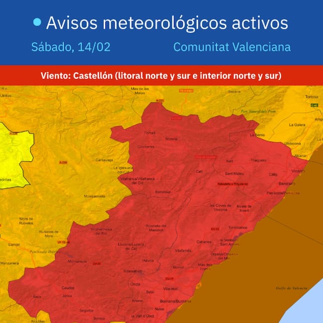 La Agencia Estatal de Meteorología ha activado para este sábado el aviso rojo en la provincia de Castellón por posibles rachas de vientos huracanados que podrían superar los 140km/h.