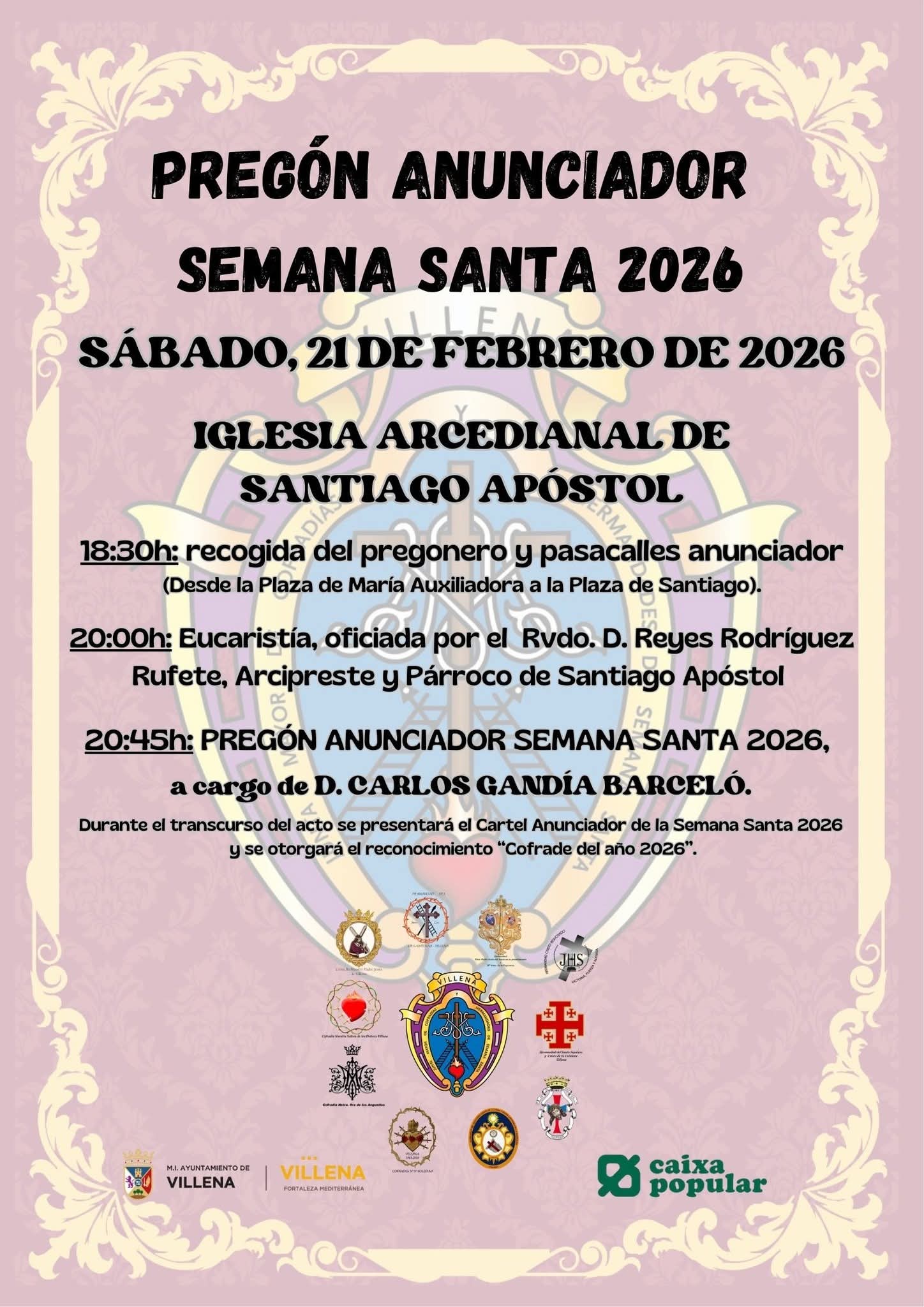 La Junta Mayor de Cofradías y Hermandades de Semana Santa de Villena celebrará el Pregón Anunciador de la Semana Santa 2026 este sábado 21 de febrero, en la Iglesia Arcedianal de Santiago Apóstol.