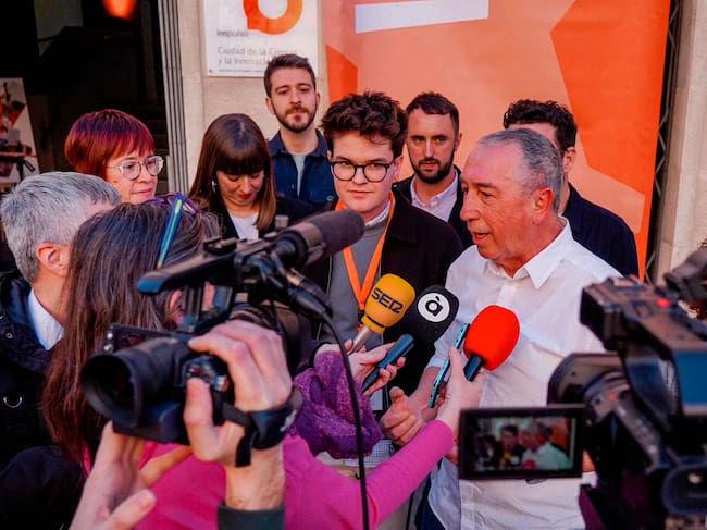 Un instant de l'atenció als mitjans que van fer Joan Guanter, Joan Baldoví i Agueda Micó, en l'entrada a l'Espai Àgora / Alberto Garsan / Compromís