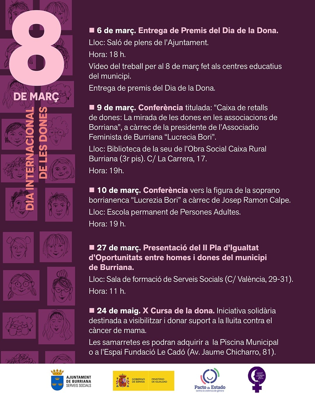 Hacia final de mes, el 27 de marzo, se presentará oficialmente el II Plan de Igualdad de Oportunidades entre hombres y mujeres de Burriana. Como cierre solidario, el 24 de mayo se celebrará la X Cursa de la Dona en apoyo a la lucha contra el cáncer de mama, cuyas camisetas ya pueden adquirirse en la piscina municipal o en el Espai Fundación Le Cadó.