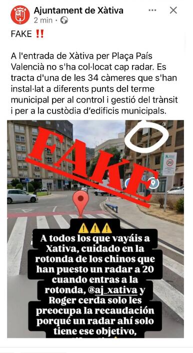 No hay un radar a la entrada de Xàtiva con fines recaudatorios. El Ayuntamiento se ha visto obligado a desmentir una falsa noticia publicada en redes sociales. Ha asegurado que en la entrada de Xàtiva por la Plaza País Valencià no se ha colocado ningún radar. Se trata de una de las 34 cámaras que se han instalado en distintos puntos del término municipal para el control y la gestión del tráfico y para la custodia de edificios municipales.