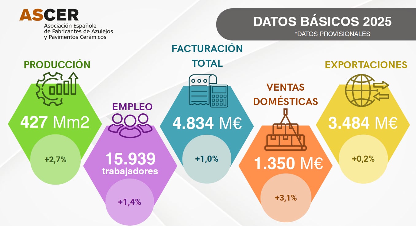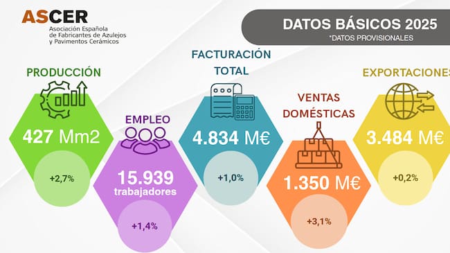 La producción crece un 2,7% hasta los 427 millones de m2, según datos del IPI, y el empleo crece también un 1,4% y se estiman 15.939 empleos directos. El presidente de ASCER, Ismael García Peris, ha puesto en valor la capacidad del sector para adaptarse a los cambios del mercado y preservar su peso industrial, apoyándose en la calidad del material cerámico, la innovación y el valor de las marcas “Made in Spain” y “Made in EU”.