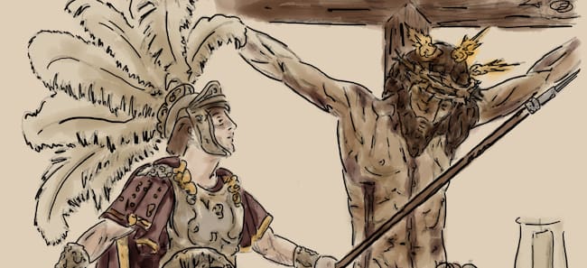 Piñas ha explicado que el cartel sitúa “como protagonista a Nuestro Señor Jesucristo en el instante de la Lanzada, acompañado por la figura de Longinos, cuya conversión en ese acto es, para mí, el auténtico centro del cartel”.