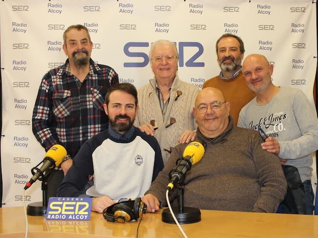 Santi Valor, Paco Aznar, Roberto Pérez, Santhidas Vélez, Germán Mollá y Diego Gómez, en el estudio central de Radio Alcoy