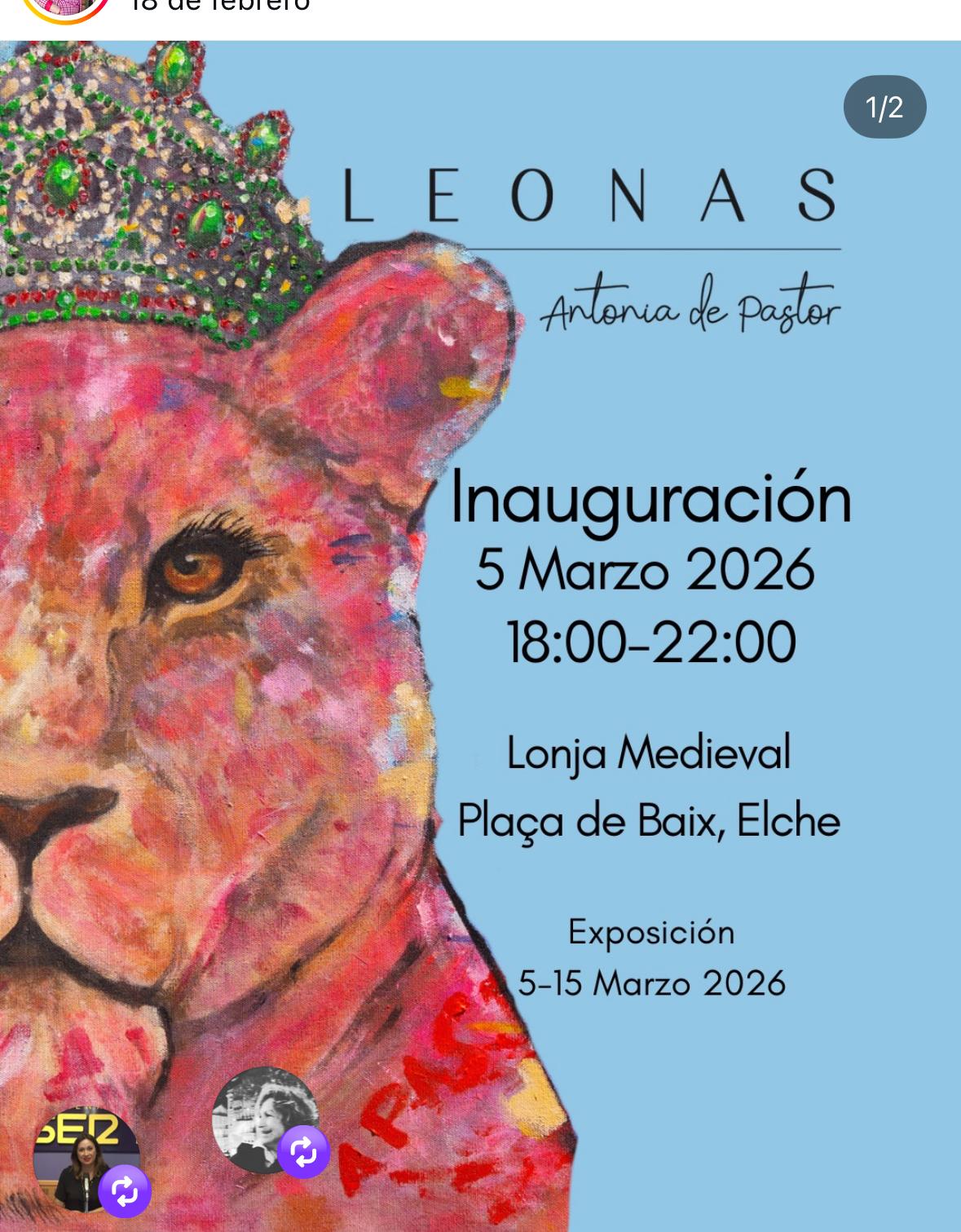 La sala de exposiciones de la Lonja Medieval de Elche acoge desde hoy la exposición “Leonas”, una propuesta artística de la pintora Antonia de Pastor que podrá visitarse hasta el próximo 15 de marzo. La muestra reúne una serie de obras de gran impacto visual en las que el color y la figura de la leona se convierten en los ejes de un universo creativo muy personal.