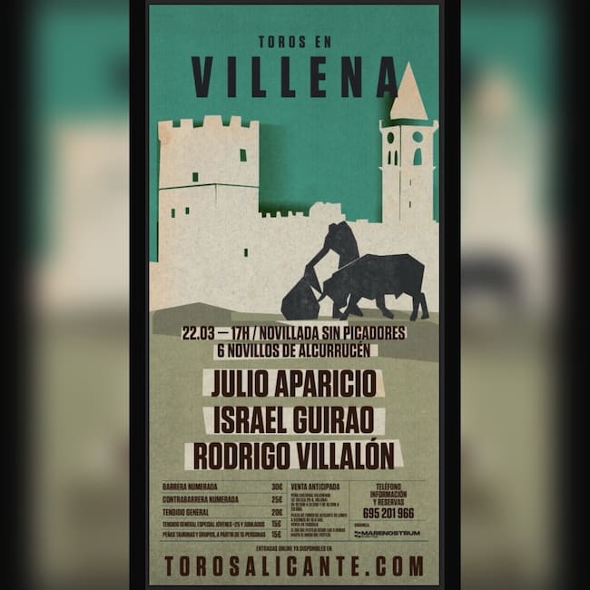 La novillada, a las 17 horas lidiará toros de la ganadería de Alcurrucén. La empresa Eventos Mare Nostrum, organizadora de la novillada, informaba que las entradas, desde 15 euros están a la venta en la Peña Cultural Taurina Villenense de 16.30 a 20 horas, en la Plaza de toros de Alicante de lunes a viernes de 10 a 14 horas, y en www.torosalicante.com ó al teléfono 695.201.966