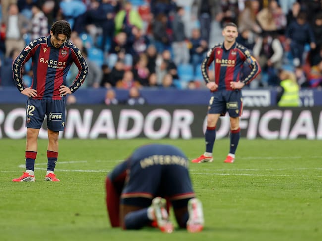 VALENCIA, 07/03/2026.- Los jugadores del Levante tras el final del partido de LaLiga entre el Levante y el Girona, este sábado en el estadio Ciutat de Valencia. EFE/ Ana Escobar / Ana Escobar (EFE)