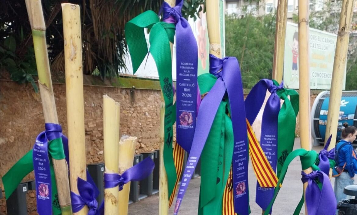 Además, en la Romeria de les Canyes de este año, más allá de las típicas cintas verdes magdaleneras, se han podido ver coronando las cañas 2.000 cintas moradas repartidas por la Coordinadora Feminista de Castellón en conmemoración del Día de la Mujer.