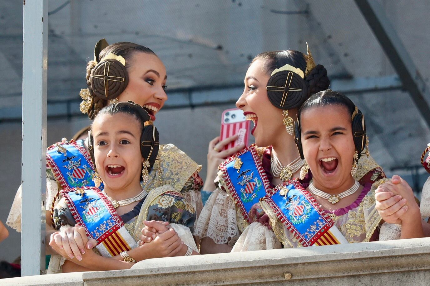 Al finalizar el disparo, los responsables de la pirotecnia han subido hasta el balcón del Ayuntamiento, donde han saludado a las falleras y, seguidamente, al asomarse, han recibido un ovación por parte del público presente.