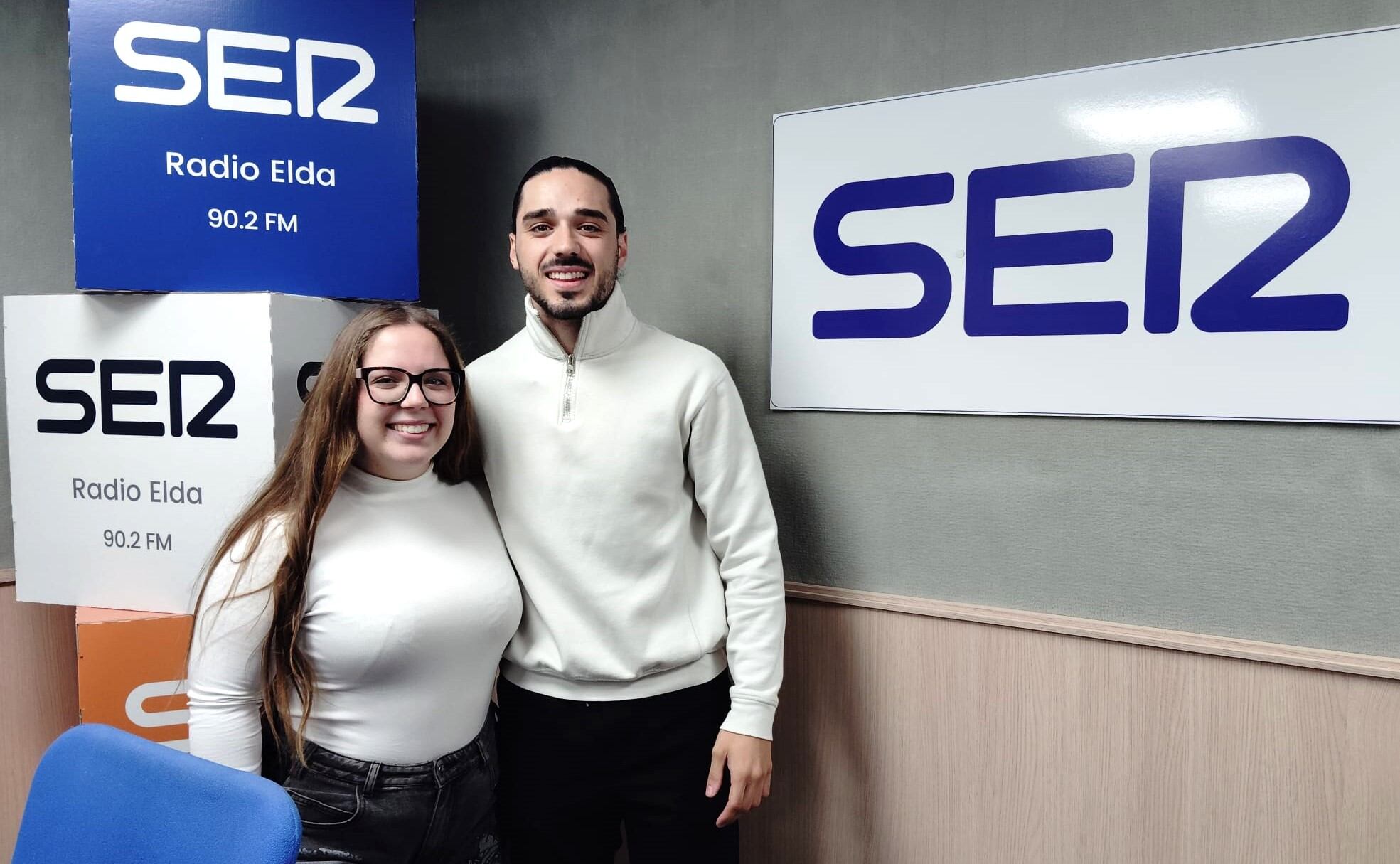 Itziar y Aitor Samper Marco, abanderada y capitán para 2026, visitaron los estudios de Radio Elda Cadena SER. / Cadena SER